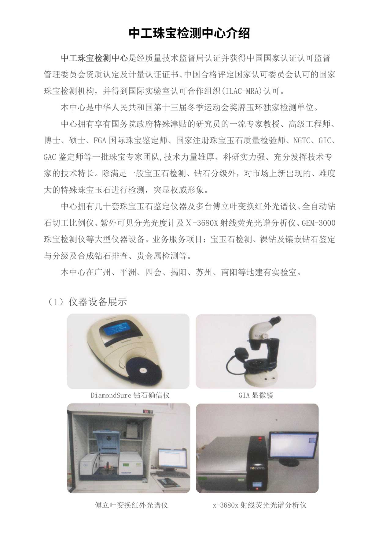 本中心拥有几十套珠宝玉石鉴定仪器及多台傅立叶变换红外光谱仪、全自动钻石切工比例仪、紫外可见分光光度计及X-3680x射线荧光光谱分析仪、GEM-3000珠宝检测仪等大型仪器设备。业务服务项目:宝玉石检测、钻石鉴定与分级、贵金属检测等。